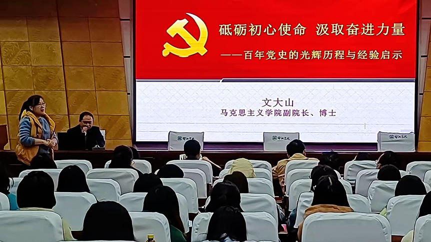 113日晚上,食品与化学工程学院在李子园校区办公楼二楼报告厅组织开展党史学习教育专题党课。本次党课由马克思主义学院副院长文大山博士主讲,题为《砥砺初心使命,汲取奋进力量——百年党史的历程与启示》,食品与化学工程学院共百余教职工党员和学生党员参加,学院党总支书记夏湘主持。