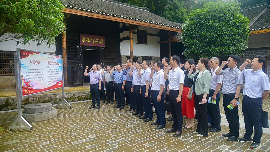 在贺绿汀故居,党委书记彭希林领誓,党委副书记、校长葛金文及党委班子全体成员、二级党组织书记佩戴党徽,面向党旗,举起右拳,重温入党誓词,坚定共产党人的初心与使命。