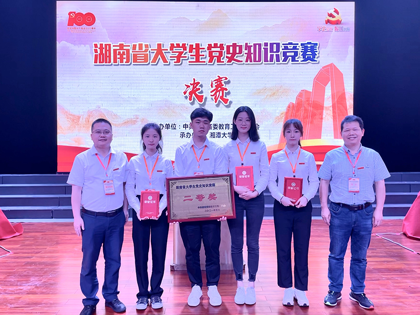 5月15日,湖南省大学生党史知识竞赛决赛在湘潭大学举行,beat365官网由城乡建设学院2019级地理科学2班刘婧萱、艺术设计学院2019级室内与景观设计5班秦浩然、食品与化学工程学院2019级化学1班雷佳、机械与能源工程学院2019级热工班刘培鑫4名同学组成的代表队经过前期初赛、复赛和决赛三轮角逐,凭借扎实的理论功底、良好的精神风貌和过硬的现场表现,最终荣获二等奖。马克思主义学院党总支书记易佑斌作为领队兼指导老师、姜敏老师作为指导老师参加决赛并出席颁奖典礼。