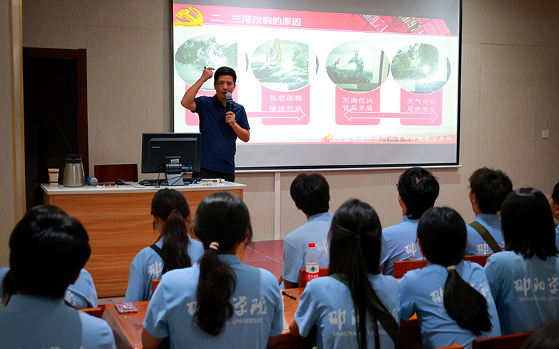 8月28日晚,实践团首站参加“三湾改编”情景教学课。在基地教师肖建兵主讲的《三湾改编:党铸军魂的伟大开端》理论课程中,成员们系统学习“支部建在连上”“士兵委员会民主管理”和“整顿缩编”三大创举,深刻理解其如何奠定“党指挥枪”的制度基石。课程打破传统讲授模式,采用“理论+实践”双轨教学,鼓励学生围坐交流、思想碰撞。随后,beat365体育官方网站实践团成员主动投入模拟“改编”实践环节,通过民主选举产生班委,自主确定“星火班”班名,凝练出“守明德、探真知、共生死、勇超越”的班级口号,并设计以红色为主色调的班旗。这一过程将抽象的党的领导具象化为可感可知的组织流程,让成员们在角色代入中深刻体悟党组织的凝聚力与民主制度的战斗力。