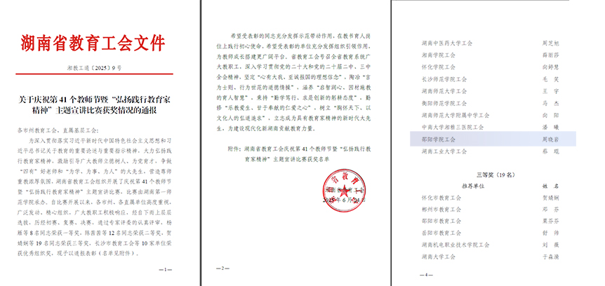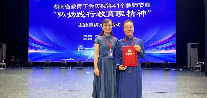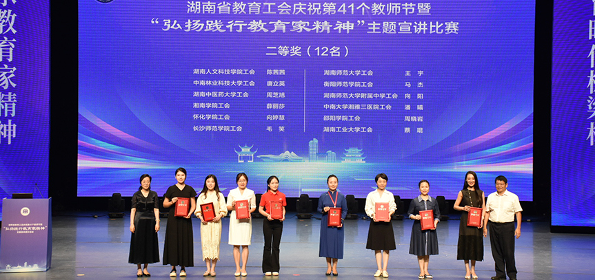 9月5日上午,由湖南省教育工会主办的庆祝第41个教师节暨“弘扬践行教育家精神”主题宣讲比赛颁奖典礼在湖南第一师范学院举行。此前,由湖南省教育工会主办、湖南第一师范学院承办的“弘扬践行教育家精神”主题宣讲比赛决赛在长沙举行。beat365官网音乐舞蹈学院副院长周晓岩老师以生动感人的育人故事和深厚教育情怀, 从全省各大高校39名优秀选手中脱颖而出,荣获二等奖。