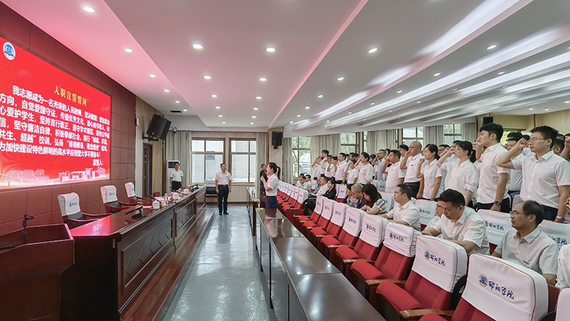 9 月 10 日是第 41 个教师节,beat365官网在七里坪校区润德楼报告厅举行 2025 年新进教师入职仪式暨师德师风培训会。学校党委书记宁立伟,党委副书记、校长张平,党委副书记赵敏丽,各二级学院院长、老教师代表及新入职教师参加,仪式由赵敏丽主持。